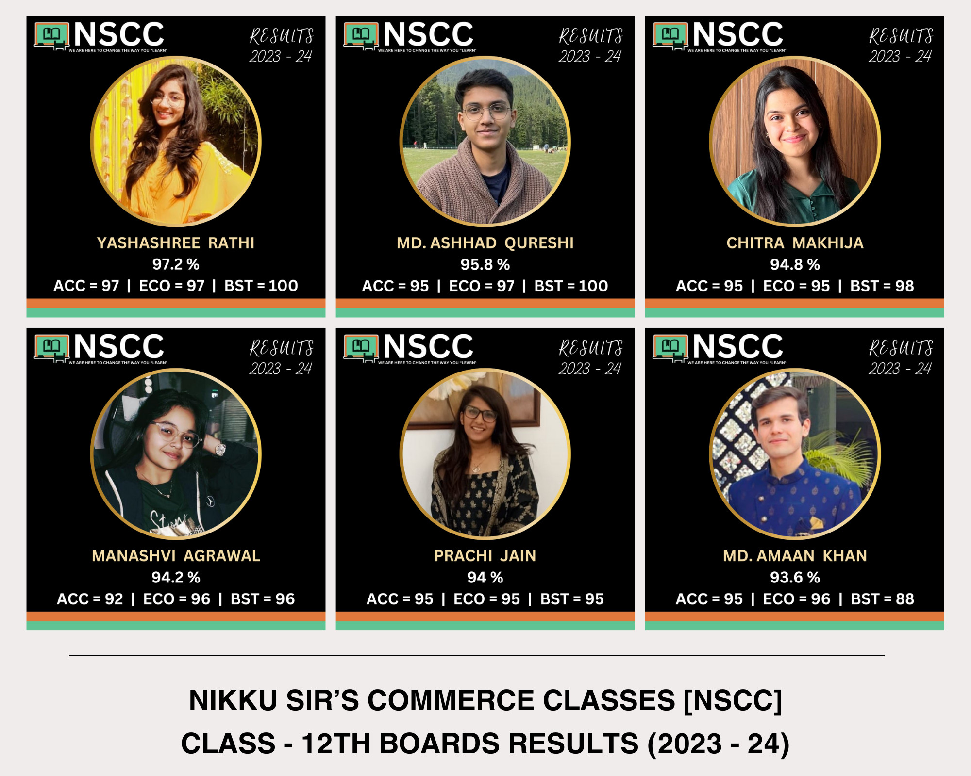 Nikku Sir’s Commerce Classes (NSCC) is a leading institute dedicated to Class 11 and 12 Commerce and CA education, delivering over 9 years of academic excellence. Known for our student-focused approach and consistent board results, NSCC has become the go-to choice for commerce aspirants aiming for top scores.